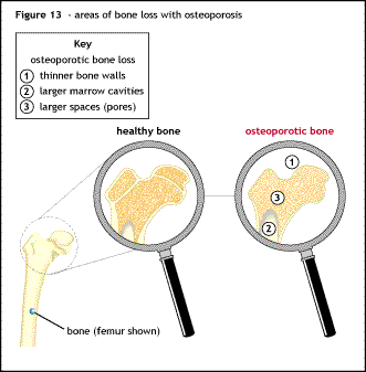 Compare the cross-sections of a normal, healthy bone and an osteoporotic bone (Figure 13). Although the entire skeleton is affected by osteoporosis, it is the spine and hips which are the most involved. There is some bone loss involved with osteoporosis: bones walls are thinner (item 1), the bone marrow cavities are larger (item 2) and the spaces or pores in the spongy bone tissue are larger (item 3).